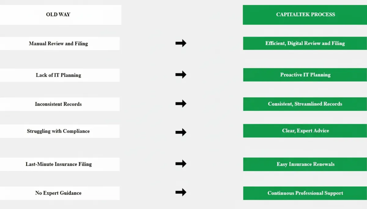 Absolutely. Our compliance services include preparing for audits, generating necessary reports, and ensuring your systems meet all regulatory requirements. With CAPITALTEK, you’ll feel confident during every audit, knowing your business is compliant and well-prepared.